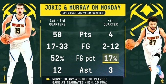 备注:约基奇和穆雷昨日末节合计12中2,命中率仅17%配资知识网 配资,两人作为队友以来季后赛末节最糟糕表现(最少10次出手)。